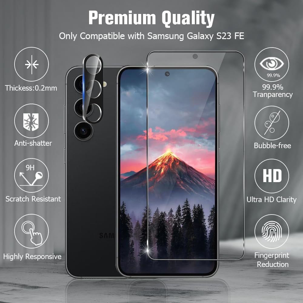 PERFECT LOOK: Screen protector designed specifically for Samsung S23 FE, not suitable for any other models, please check your phone model before purchasing. (Package includes 3-pack Galaxy S23 FE screen protector + 2-pack Galaxy S23 FE camera lens protector) POWERFUL SURFACE STRENGTH: This Samsung Galaxy S23 FE screen protector is made of high-quality tempered glass with a hardness of 9H, making it durable. This screen protector for Samsung Galaxy S23 FE looks great when applied, and its all-glass hard edges provide strong adhesion, providing excellent protection against scratches, drops, and everyday wear and tear. Touch sensitivity: The touch screen is responsive, the surface is very smooth and delicate, and the full-screen coverage hole is precisely designed. Samsung Galaxy S23 FE screen protector comes with fingerprint sensor and supports fingerprint unlocking. Anti-Fingerprint Design: Hydrophobic and oleophobic screen coating prevents sweat and oil residue from leaving fingerprints on the Samsung S23 FE screen. Scratch-resistant and waterproof. Easy to install: No complex tools or techniques required, just a few carefully placed movements to complete. If you have any problems with our products, please feel free to tell us and we will help you solve it within 24 hours.