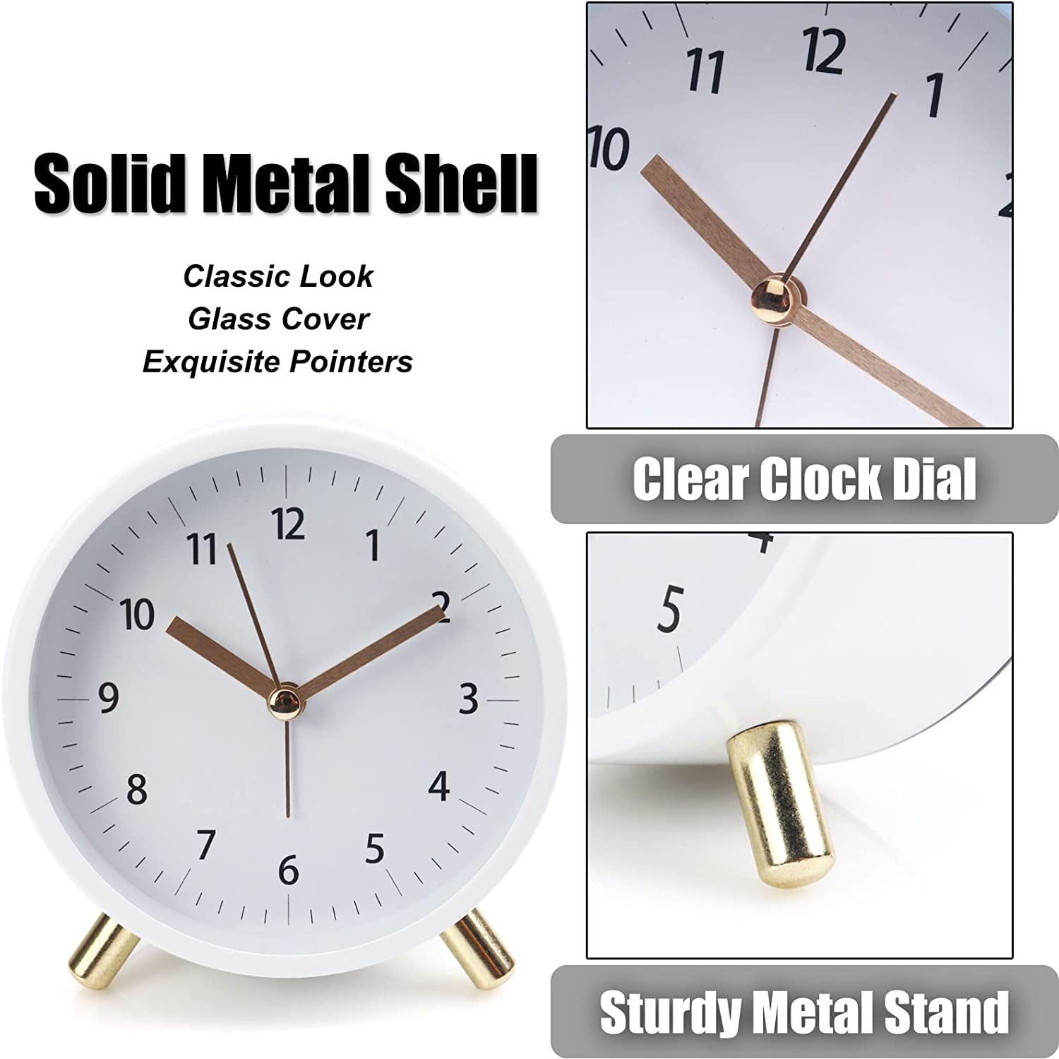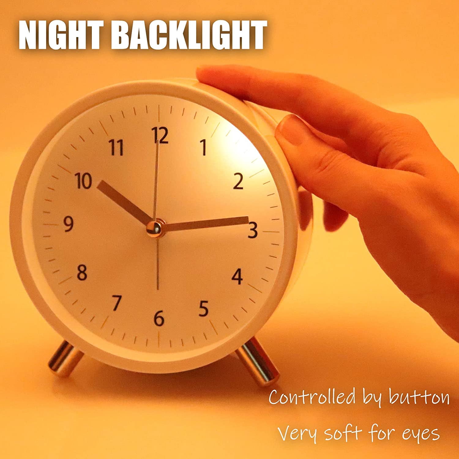 Clear Clock FaceWhite background, delicate pointers and dial make it easy to read the time. Soft BacklightThe light yellow night backlight makes your eyes comfortable while checking time at midnight. Steady StandsThe metal stands is robust, making it more stable to place the alarm clock at any flat surface. Makes Easy Life No ComplexityJust Simplicity
