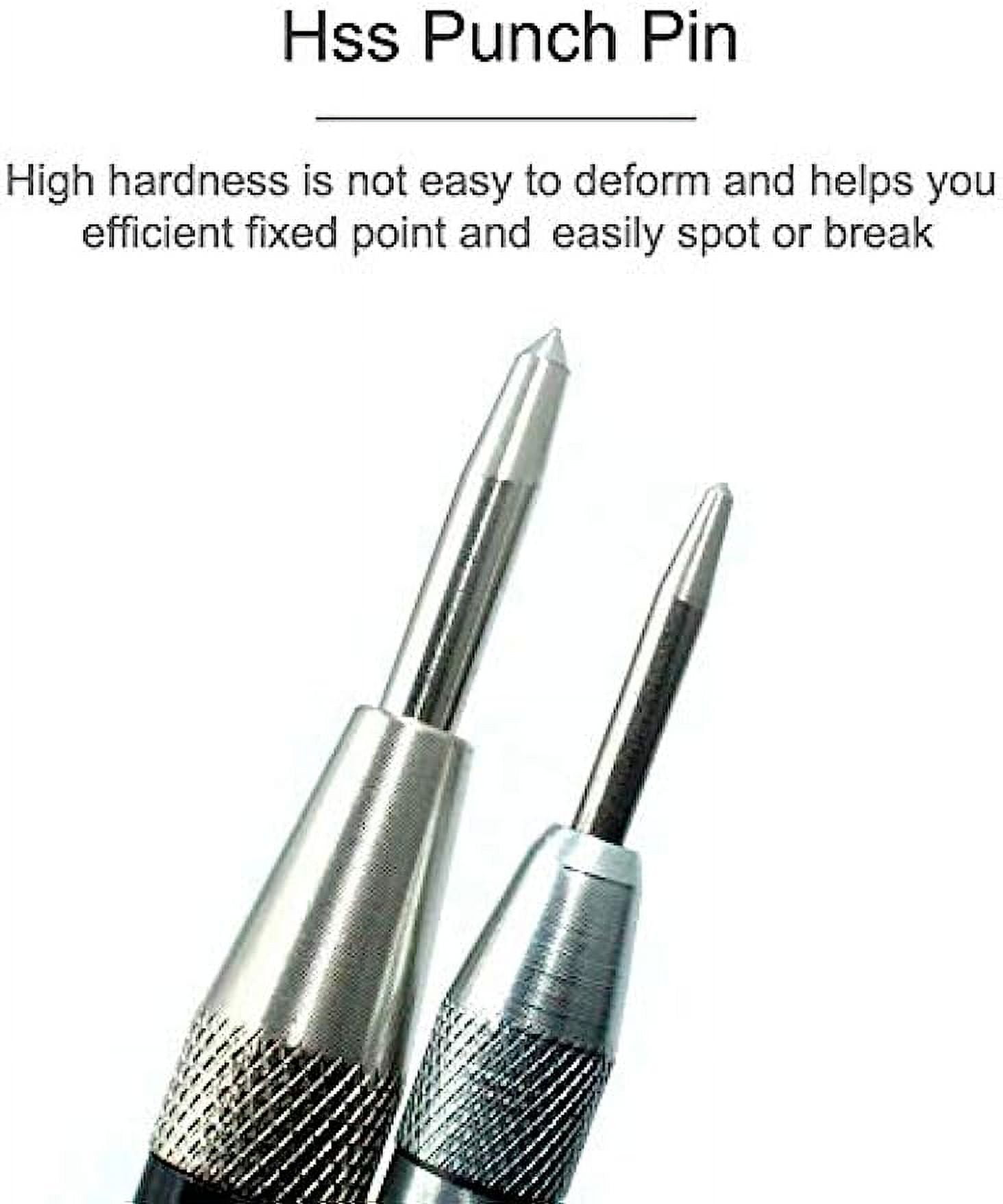 【EASY POSITIONING – ONE HANDED OPERATION】simply adjust to desired spring tension, press firmly against work piece for automatic centre punch, it makes accurate marks without the need for a hammer.The spring loaded center punch is sturdy, durable and has high impact force, which can be used quickly. 【HIGH-END MATERIALS】The center punch tip is made of high speed steel that holds up to strong impact, wear resisting and rust proof to prolong the punch life, Its thimble hardness reaches 58°-65°. Compared with the conventional center punch, the spring loaded center punch does not need a hammer to strike, but uses the internal spring to generate impact for positioning, which is more convenient and durable. 【MULTI-USE】 Automatic center hole punch is suitable for a variety of tasks, such as mark on materials, car emergency tools, furniture installation, machine maintenance, alternative emergency hammer, and Iron plate positioning, wood positioning, wall positioning, etc.Suitable for wood, iron, ordinary steel and other materials. 【IMPACT STRENGTH ADJUSTABLE】the impact force can be adjusted at will, you can simply tighten the cover clockwise or counterclockwise, and then fix it to a fixed hole, so you can get the depth you need. Spring tension adjusts for light or heavy strokes, marking, punching and staking. 【MORE SLIP RESISTANT】According to the ergonomics, the non-slip diamond pattern design is adopted, which can increase the friction between the hand and the spring loaded center punch handle during operation, so that it is easier to maintain vertical to the workpiece, and it is easier to force the positioning hole.