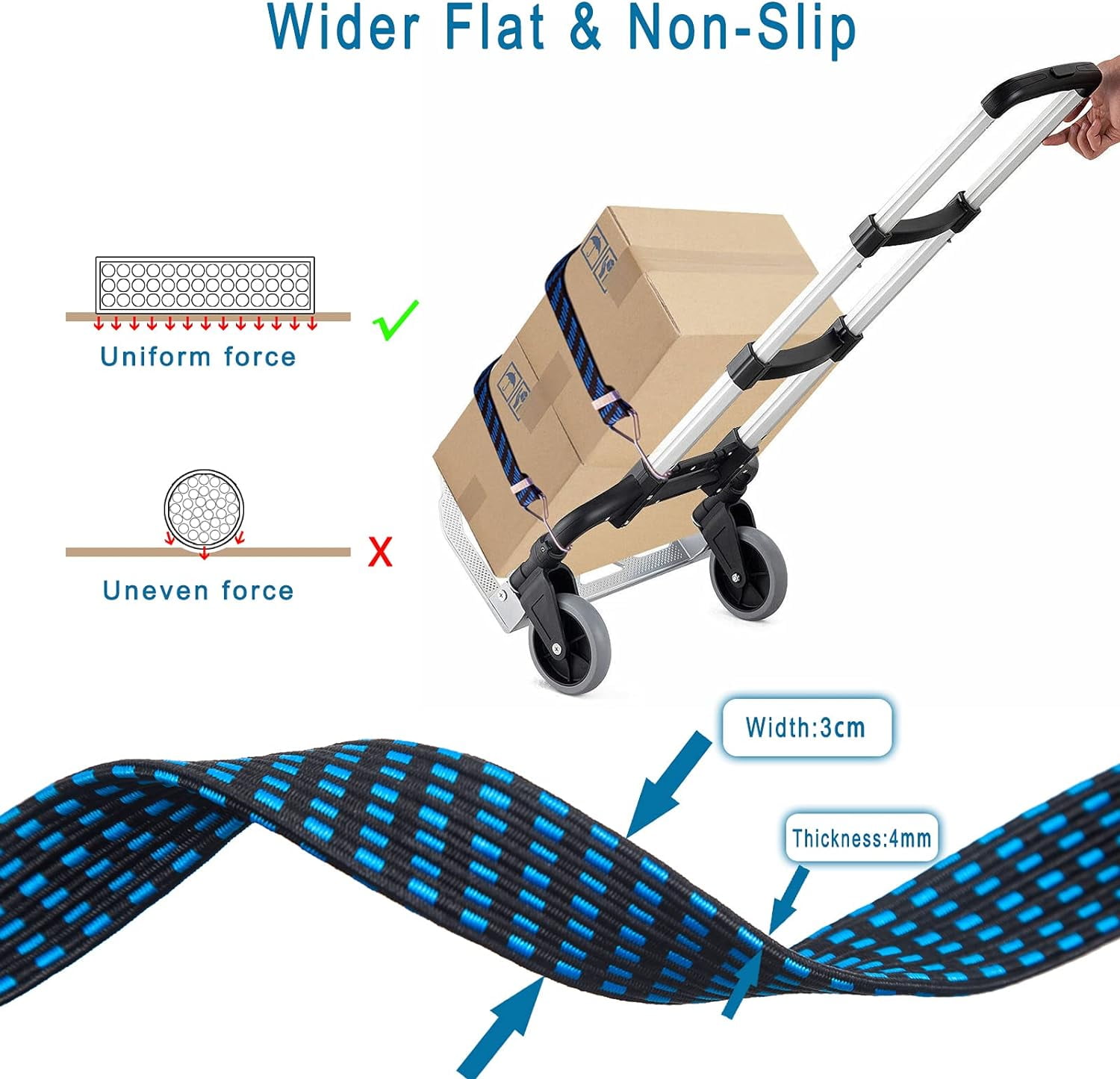 【New wider flat non-slip design】 wider flat bungee cords with 3cm width and 4mm thickness is good for spreading pressure on the greater surface area of the cargo. Compared to an ordinary round bungee cord, the wider flat bungee strap can hold the cargo more firmly. 【Enhanced-lasting flexibility】The bungee cords are made of premium latex and oxford fiber which makes them much stronger and elastic than regular rubber bungee cords. It has 2.5 times the pulling force and strong rebound force, and the nylon yarn exterior has good weather resistance, which make it can be used for a long time without deformation. 【High-quality hook】Chrome-plated double-layer metal hooks won’t break or rust and adopt triangular ring hook design for more even force. The elastic rope end node fastened with durable aluminum alloy buckle, which is much stronger than the sewing end node. 【Adjustable & Freely combinable hook connection】Available in 2 pcs flat bungee cords can be adjusted to different length and combined freely, and there is a metal ring on each bungee cord for connecting the hooks if needed. 【Multifunction use】The bungee cords set is an ideal tool for many different needs. It can be used not only for fastening luggage on bicycles, motorcycles or cars, but also for moving boxes, home use, camping or hanging clothes, etc. which make your life easier.