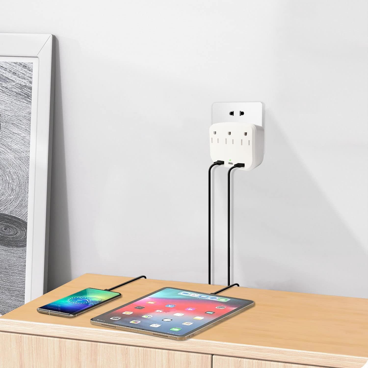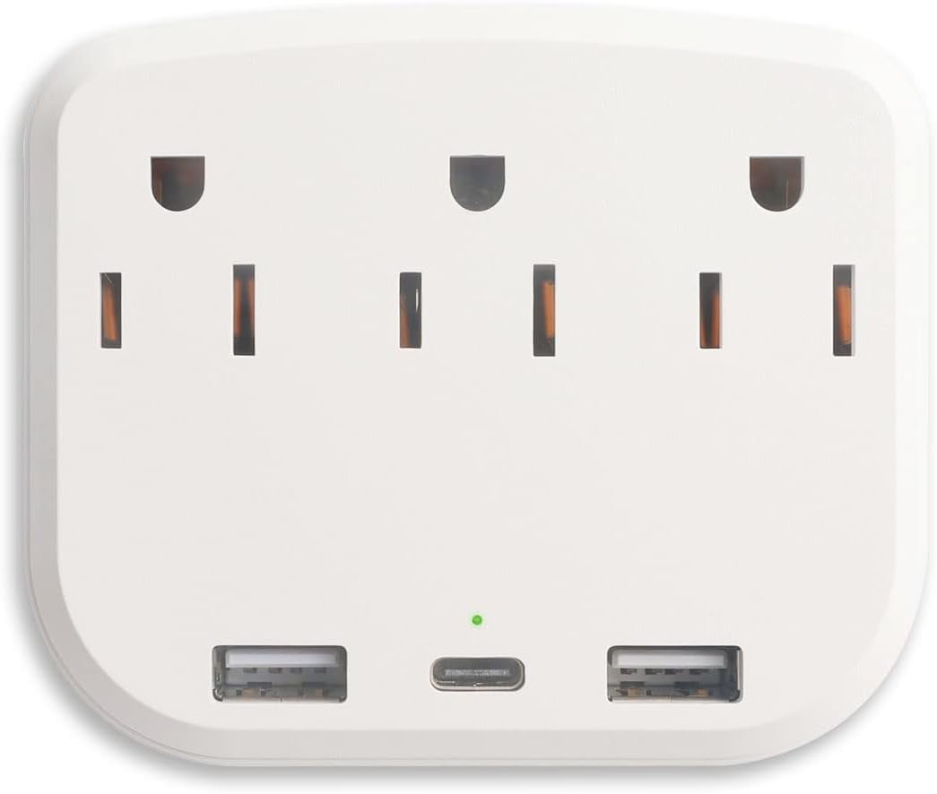 6 in 1 Multi Plug Outlet Extender: wall outlet extender with 3 AC outlets ( 15A/125V/1875W ), 2 USB ports ( 5V/3A Max. ) and 1 USB C ports ( 5V/3A Max. )(total output DC 5V/3.4A) ,you can charge 6 electronics from one plug simultaneously,that meets most of your needs in life. Easy to Carry:Compact and lightweight design make this plug extender very easy to carry.Without extension cord,small and compact easy into luggage and briefcases. Multiple Protections:Fire-resistant ABS shell, and high-quality component can improve durability and safety.Built-in overload protection, short-circuit protection, over current protection, over-voltage protection and overheating protection.Prevent your electronic devices from over-current/overheating,ensure you use it safely. Widely Use:Compact and smart design can be used in multiple occasions, No messy power cable can save space and make the socket look more concise and orderly,Perfect solution for dorm room, bedside, kitchen, office and hotel.The phone holder design is convenient for you to better use your mobile phone when washing, cooking or working.