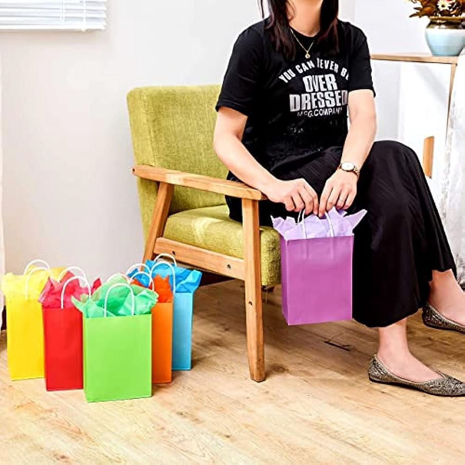 12 Pieces Kraft Paper Rainbow Party Favor Gift Bags with Handle Assorted Colors (Rainbow) Size: 8.66 x 6.3 x 3.15 inch environmental paper bag. 4 bags for each color: red/orange/yellow/green/blue/purple. Easy for standing up and carrying. These colorful gift bags are perfect for birthday treat bags, the goodie bag, party bags, gift bags, party favor bags, wedding bags, retail bags, and more..
