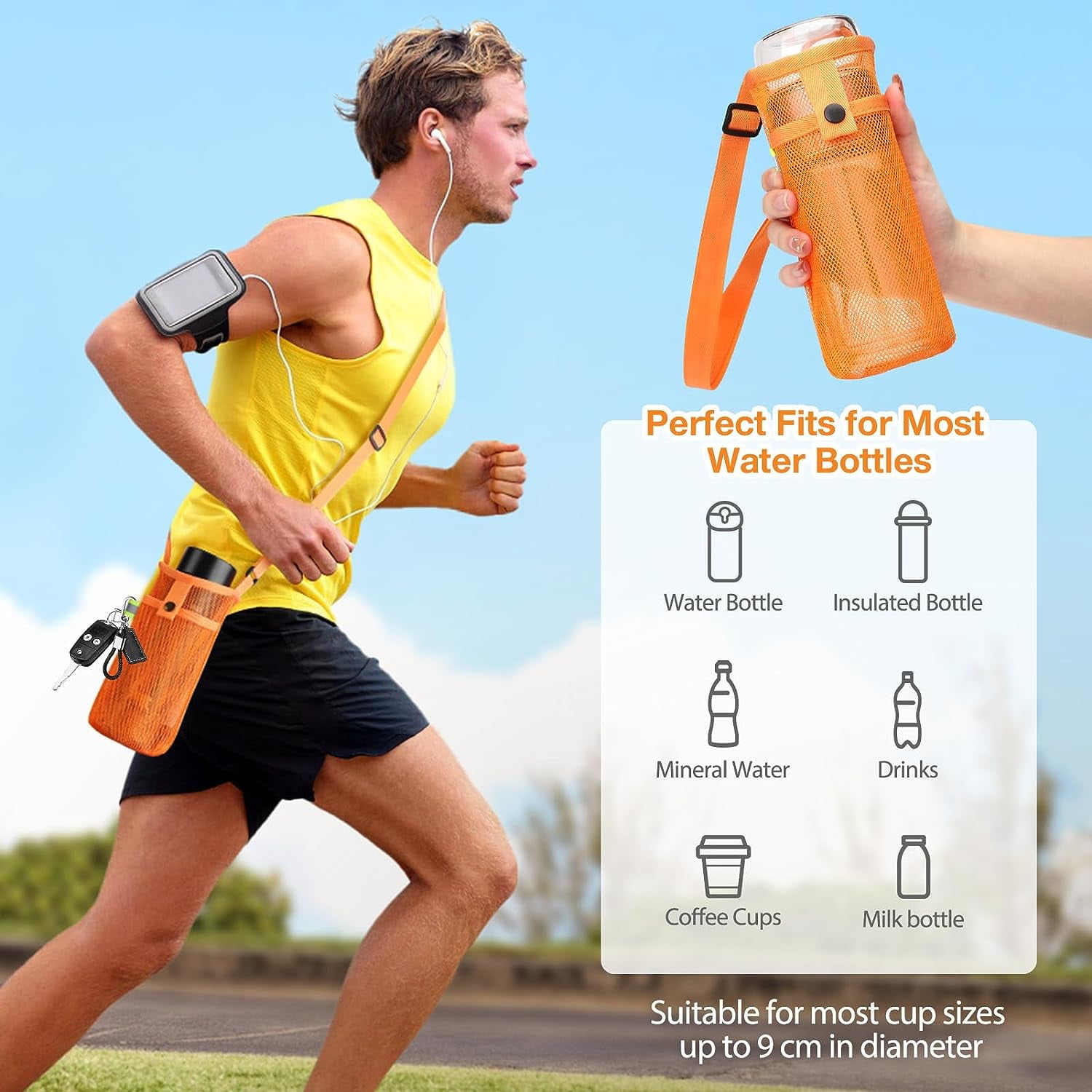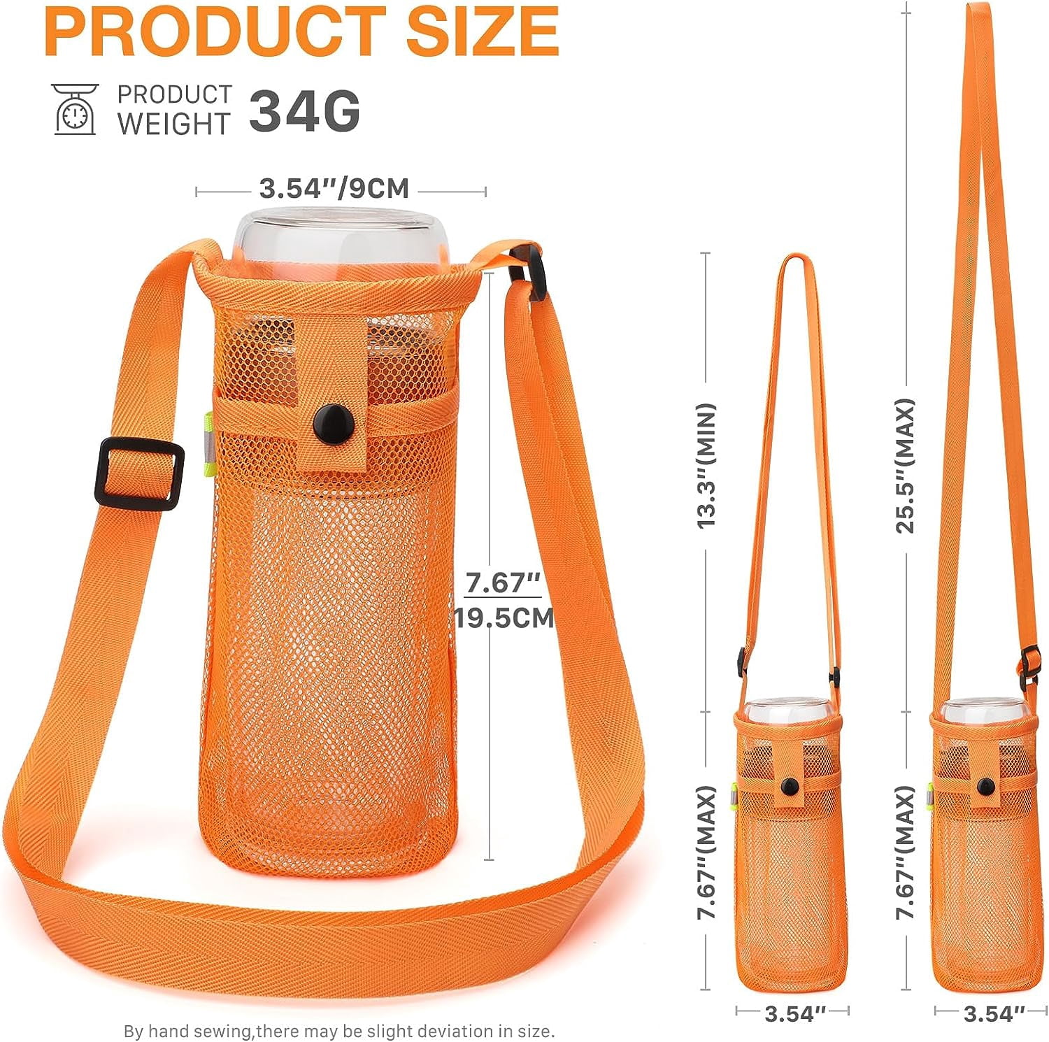 Water Bottle Bag with Strap, Mesh Water Bottle Holder Crossbody Water Bottle Sling Bag Adjustable Shoulder Strap and Pocket – Lightweight Water Bottle Carrier for Walking Sports Hiking Orange